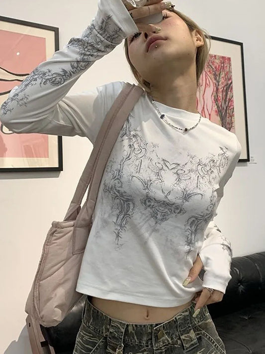 Y2K T Shirts Women Vintage O-neck Tee Ladies Long Sleeve Grunge Print Casual Crop Tops Female Graphic Japanese Streetwear
