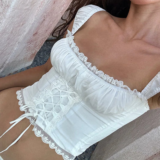 Y2K Tie Up Square Neck Sleeveless Crop Top Lace Trim White Milkmaid Tops Cute Shirts Coquette Summer Clothes